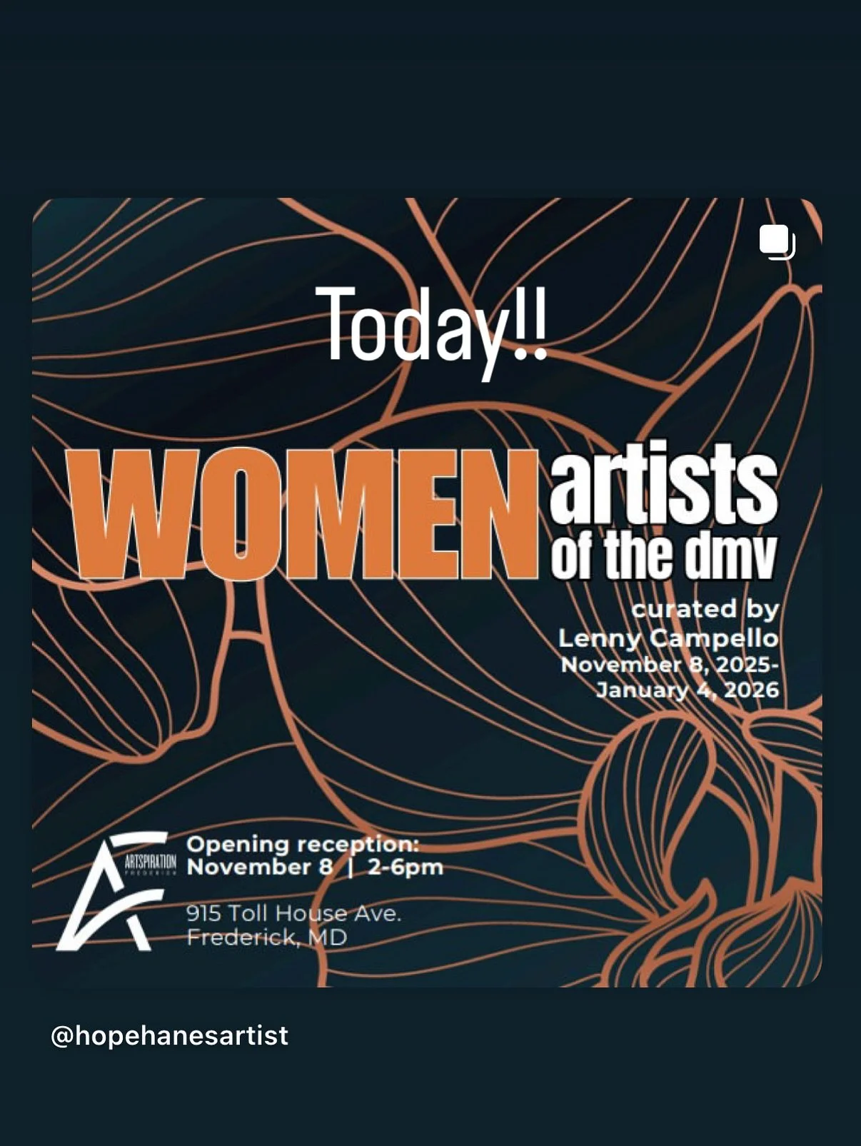 November1, 2025-January 4, 2026: Women Artists of the DMV exhibition at ARTspiration in Frederick, Maryland. Hope’s painting “Distant Dream” was selected for this show. Read more about this multi-venue exhibit here.